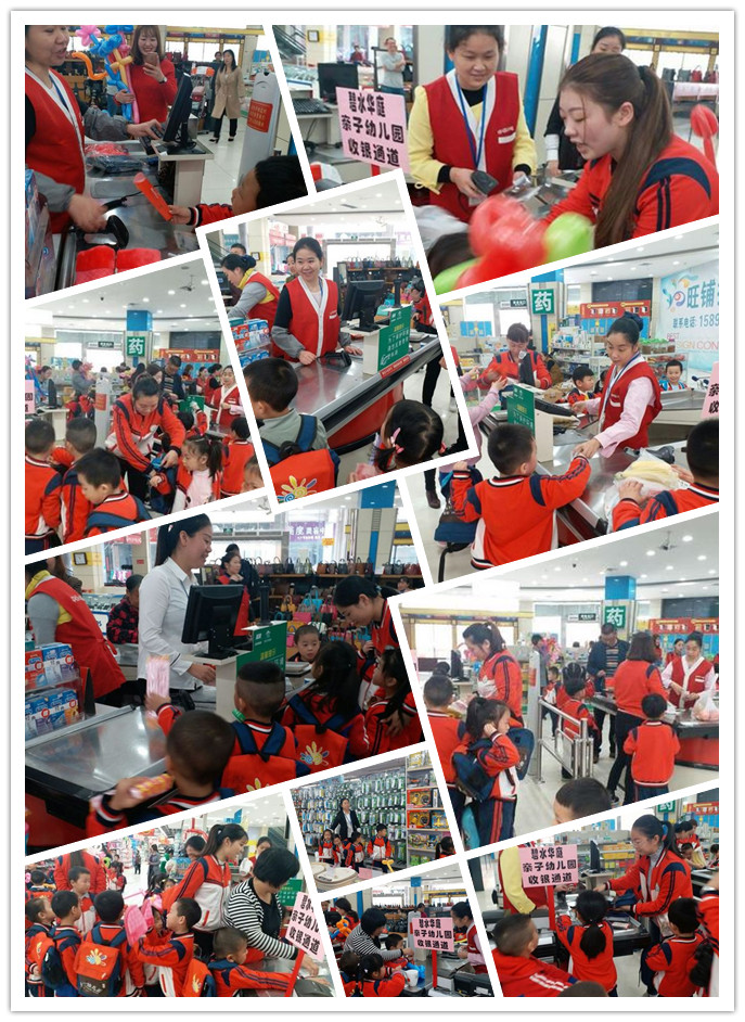分管经理仇丽姿,收银课长李倩,防损课长刘哲梅全程协助老师维护小朋友现场秩序,为小朋友结账收银,将商品交到一双双小手上。