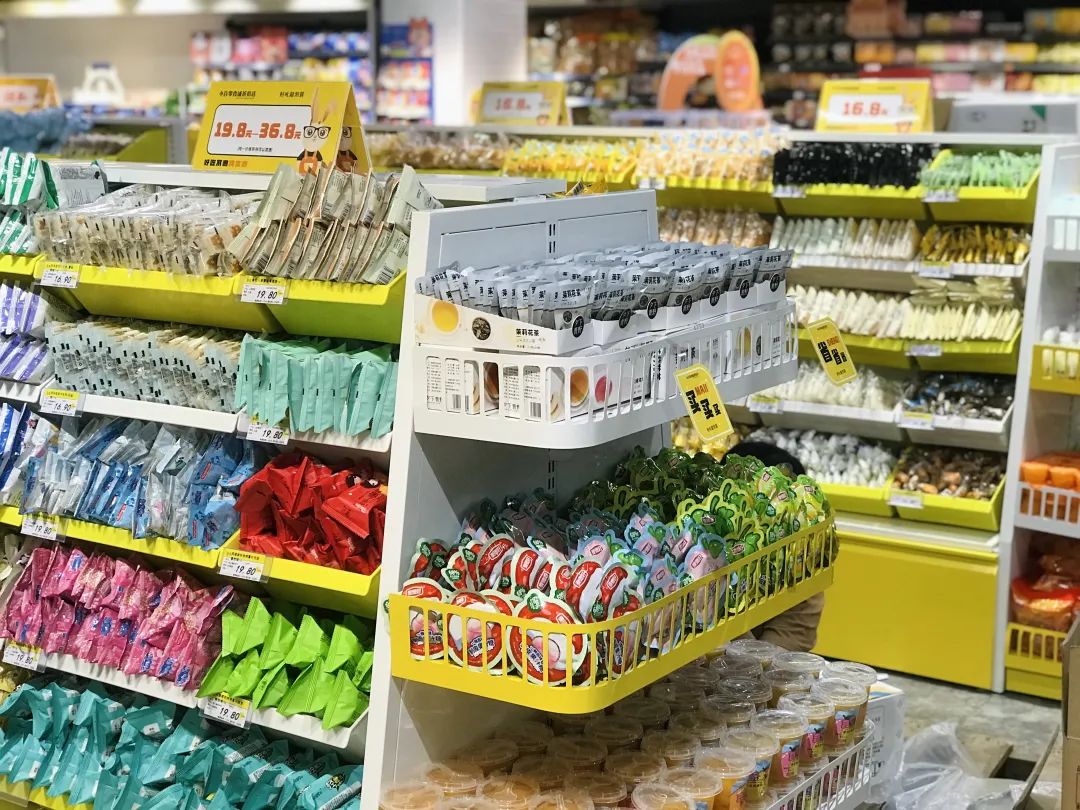 商品陈列对顾客消费行为有着巨大的影响,此次小百零食铺场内折扣店坚决打破原先类别品牌集中的陈列原则,以商品所处价格带为陈列依据,在货架最显眼处放置价格带标识。同时,将原有卧柜正面平铺的陈列方式转变为货架式插式陈列,类别丰富极具量感,让顾客更好地充分感受物有所值、琳琅满目的购物体验。