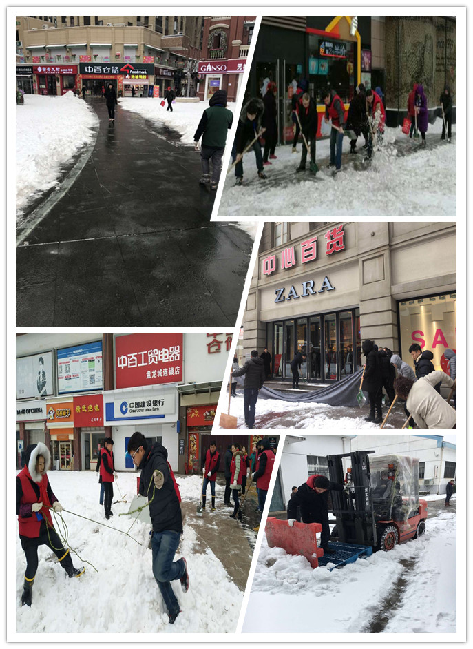 集团各公司及各门店积极启动预案工作,在各负责人的带领下人人提锹带铲分工协作,冒着风雪,在各自门前清扫着道路。为了行人及车辆的行走、行使安全,大家在门前、坡道处,行车处铺垫上了地毯和防滑布袋。通过大家的通力合作,很快的为顾客开辟出安全而宽敞的行走购物通道和车辆安全通道,大家个个哈着热气,流露着轻松的笑容,冰冷的大地经过大家辛苦劳动使得热气升腾。